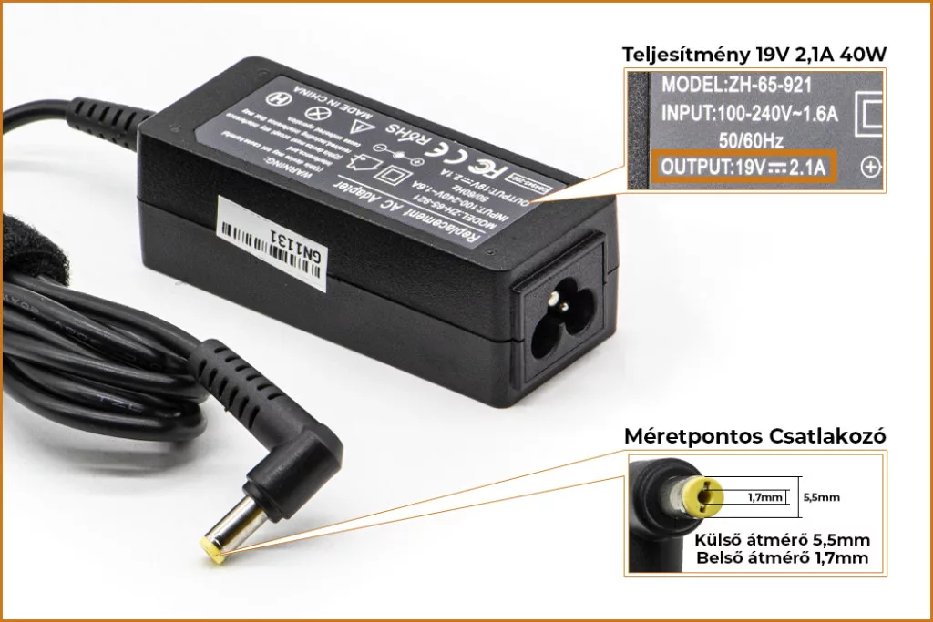 Kerek Csatlakozó méretei, amit a laptopba dugsz: kívül 5,5mm, belül 1,7mm!