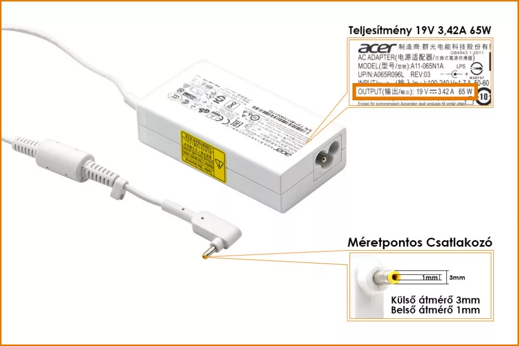 Acer Aspire UltraBook, Iconia Tab 19V 3.42A 65W 3mm/1mm fehér töltő, ADT11.00Q, KP.06503.009