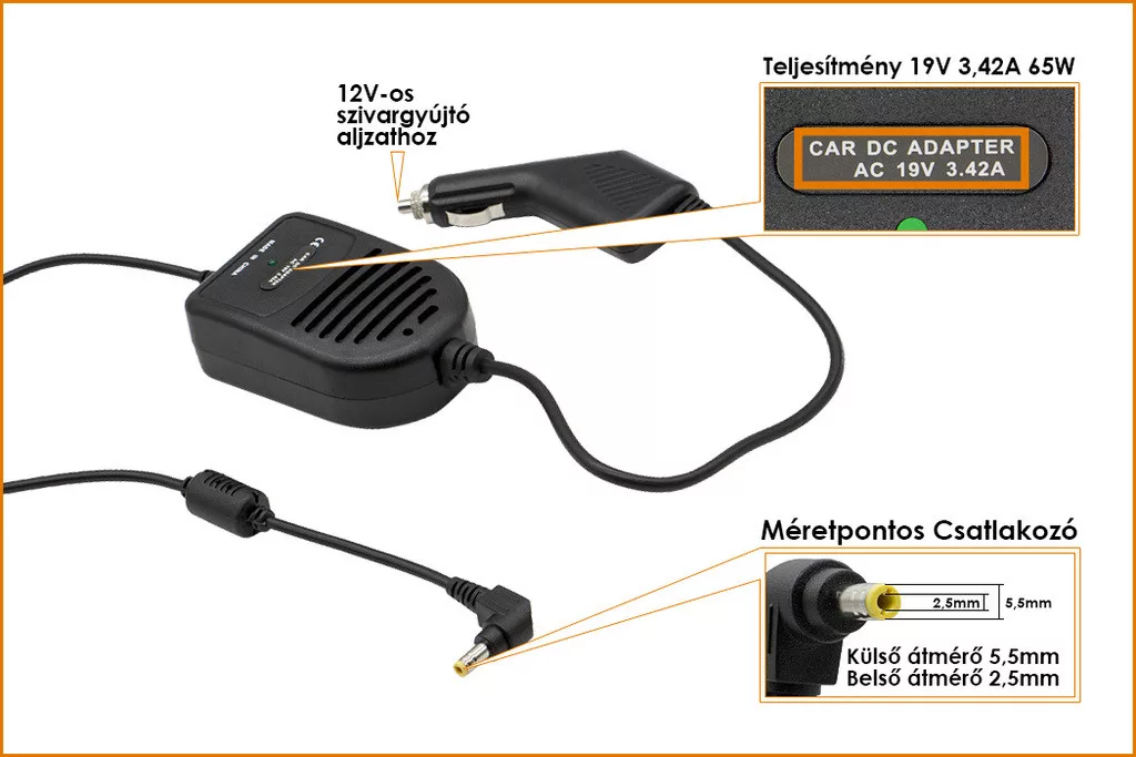 Asus 19V 3.42A 65W helyettesítő új autós töltő