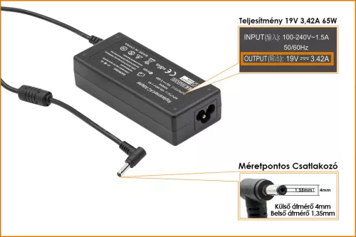 Asus UX303, TP300 19V 3.42A 65W helyettesítő új töltő, 0A001-00045900, 0A001-00441200 (csatlakozó átmérő: 4mm/1,35mm)