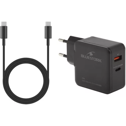 Bluestork Hálózati töltő - PW-BS-65-GAN-C-A (USB-C, USB-A, 65W, 1,8m kábel, gyorstöltés, fekete)
