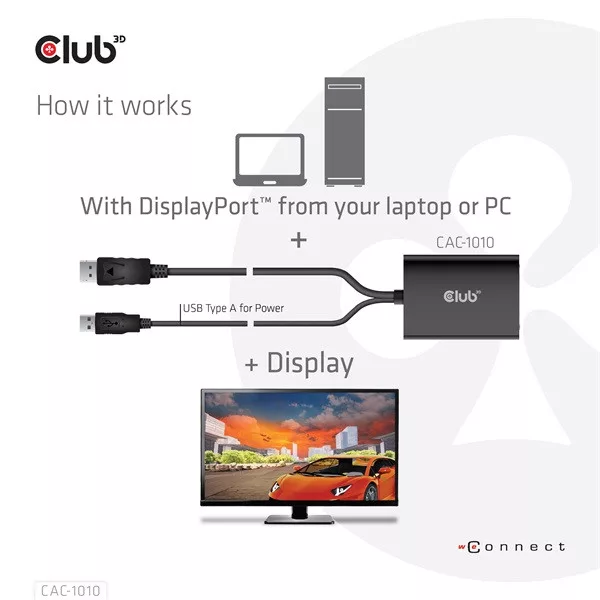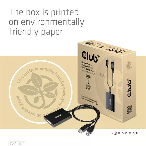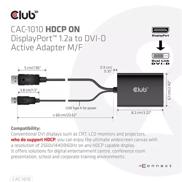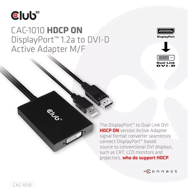 Club 3D Átalakító - CAC-1010 (DisplayPort to 2xDVI-A HDCP ON, 4K30Hz, 2560x1600@60Hz, 60cm)