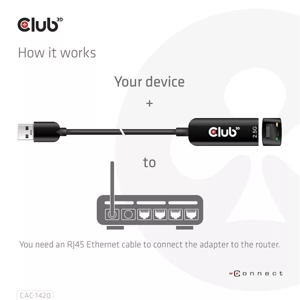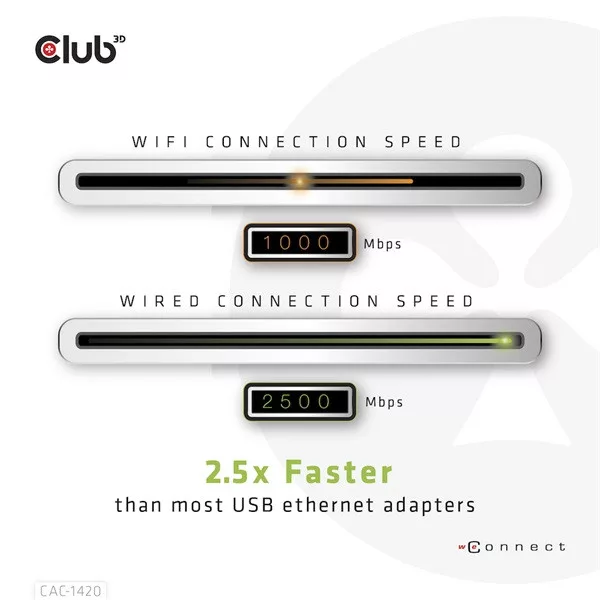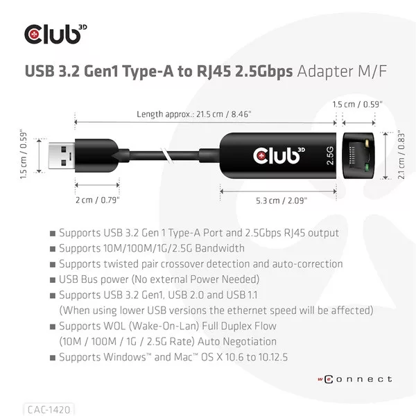 A Club 3D CAC-1420 USB 3.2 Gen1 Type-A – RJ45 2,5 Gbps Ethernet adapter. Lehetővé teszi a Fast Ethernet hálózati csatlakozást asztali számítógépekhez, notebookokhoz vagy Ultrabookokhoz szabványos USB 3.2 Gen 1 Type-A porttal.