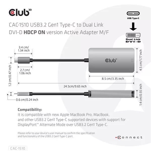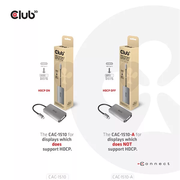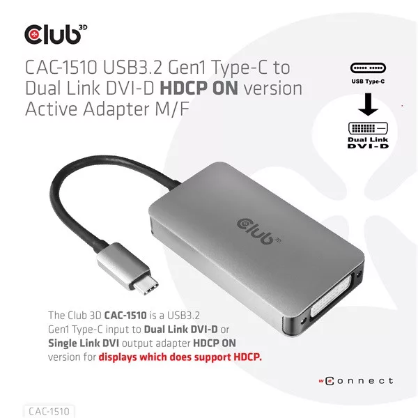 Club 3D Átalakító - CAC-1510 (3.2 USB-C Gen 1 to DVI-D Dual Link, HDCP ON, 4K30Hz)