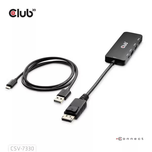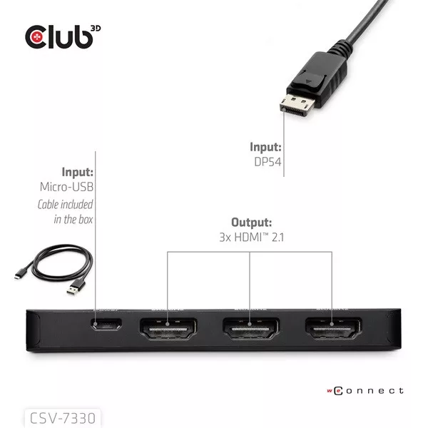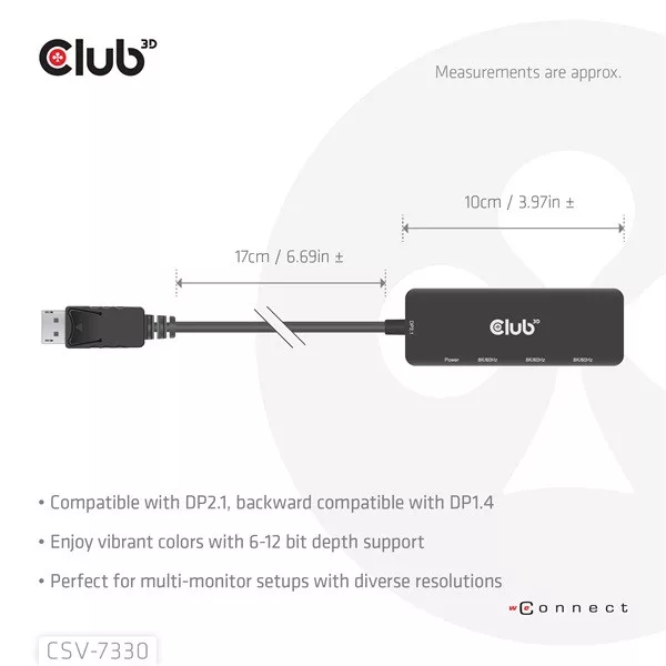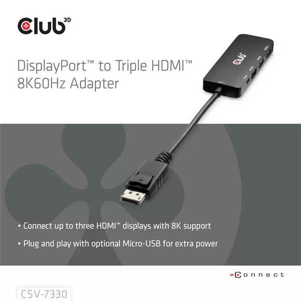 Club 3D Átalakító - CSV-7330 (DisplayPort 2.1 to 3xHDMI, 8K60Hz, HDR, HDCP 2.3, HPD, ALT mode)