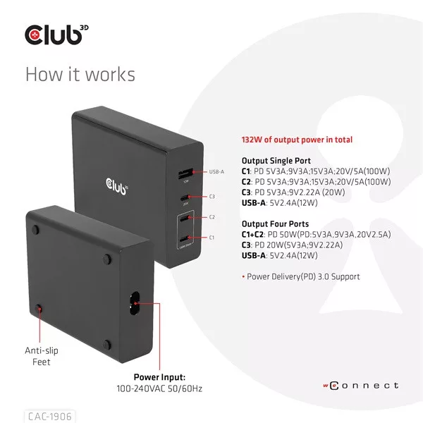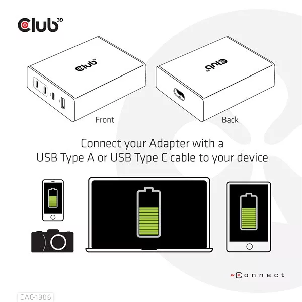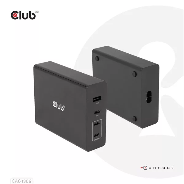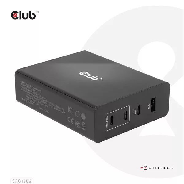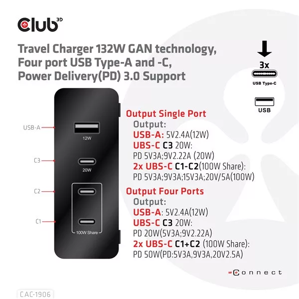 Club 3D Hálózati Adapter - CAC-1906 (132W GaN, 2x USB-A, 2x USB-C, PD3.0, 4 csatlakozó)