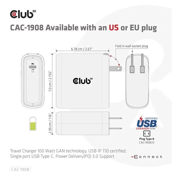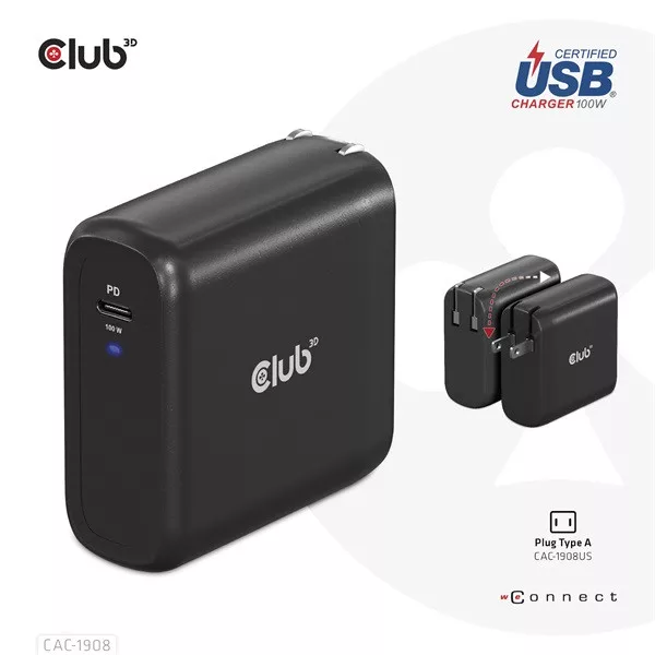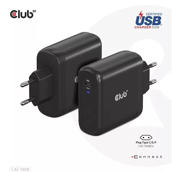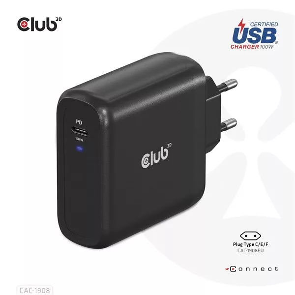 Club 3D Hálózati Adapter - CAC-1908EU (100W GAN, USB-IF, egyportos USB-C, PD 3.0 támogatás)