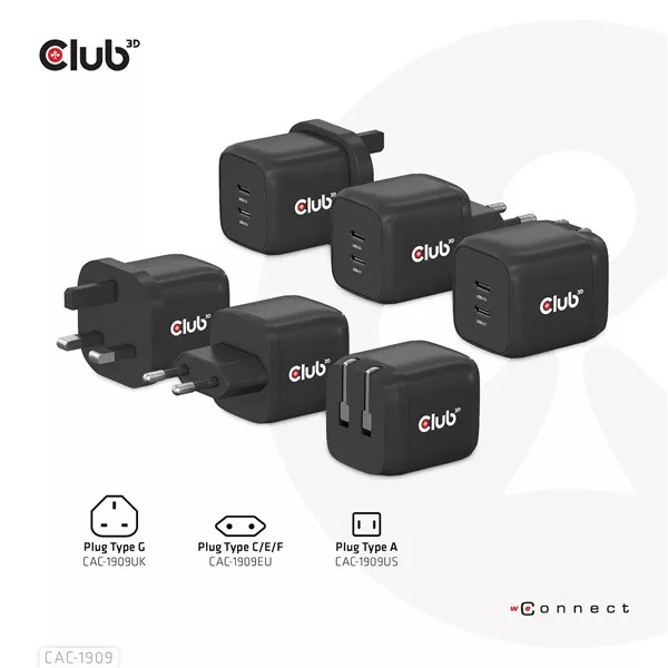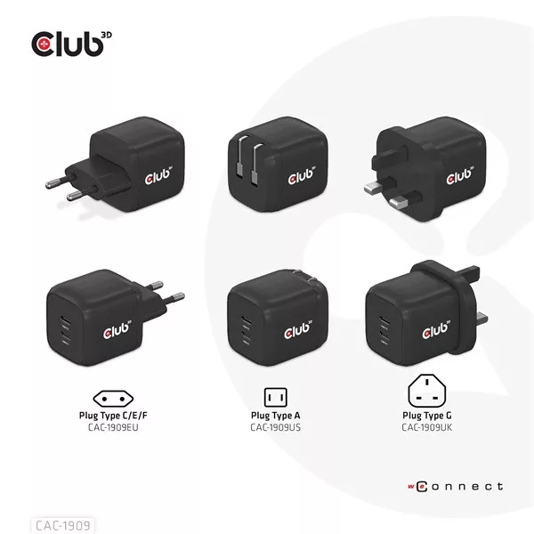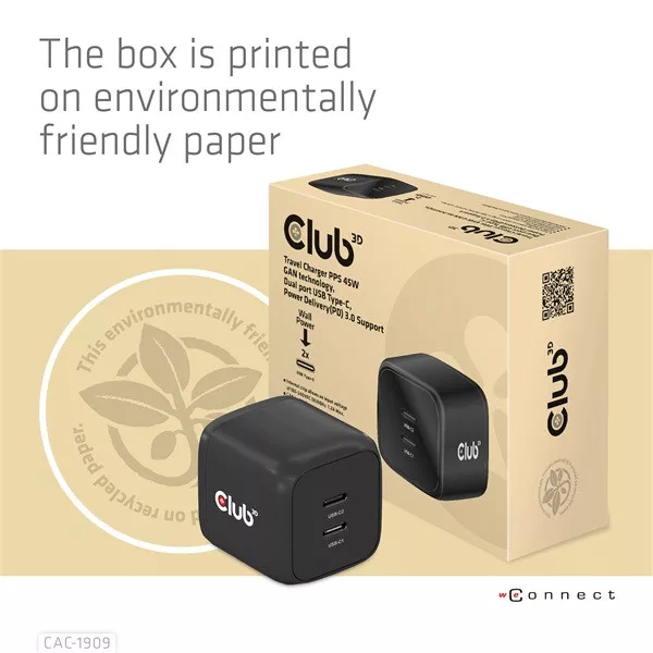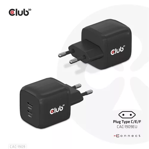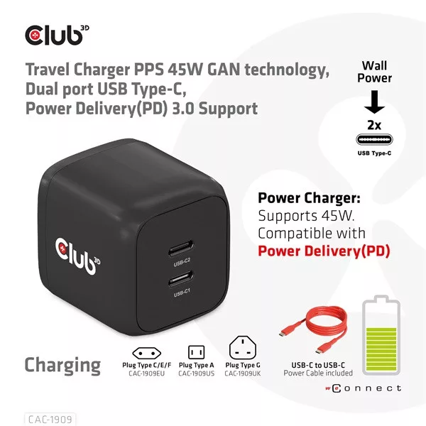 Club 3D Hálózati Adapter - CAC-1909EU (45W GAN, USB-C Dual Port, PD 3.0, PPS, Kétportos)