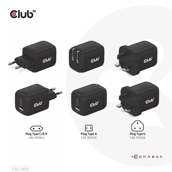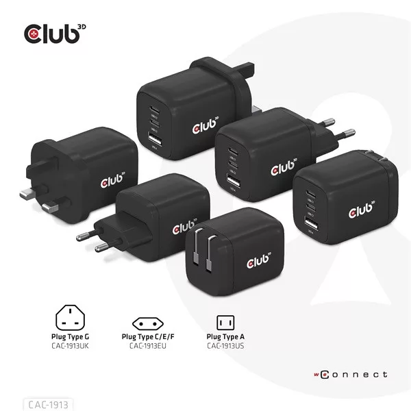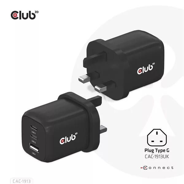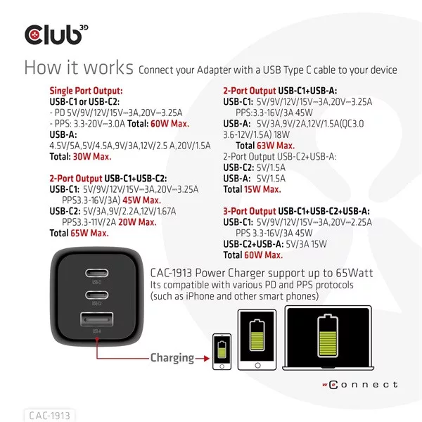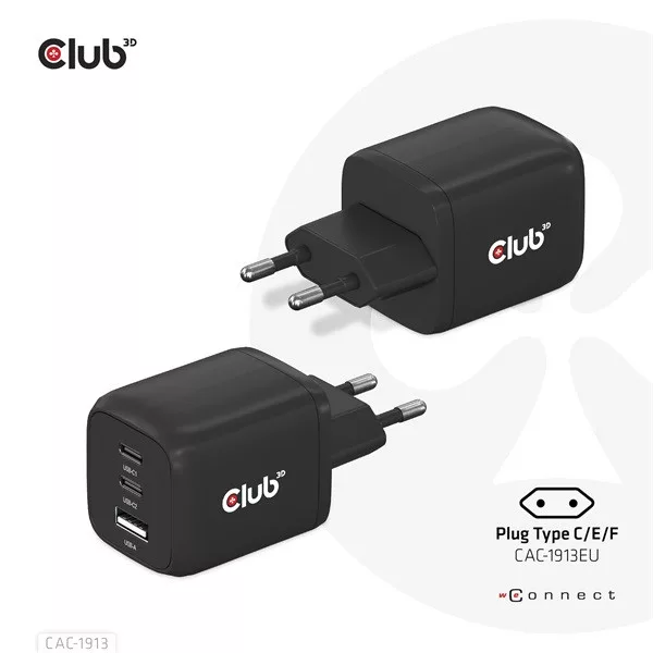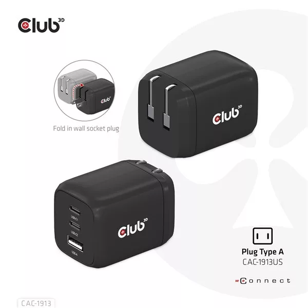Club 3D Hálózati Adapter - CAC-1913EU (65W GAN, Triple port 2xUSB-C 1xUSB-A PD 3.0)
