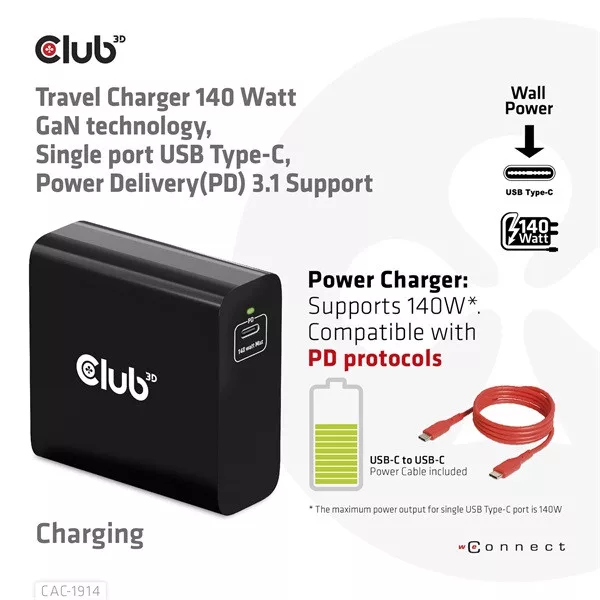 A Club 3D CAC-1914 Utazó Töltő 140 Wattos GaN technológiával, egyetlen USB Type-C porttal és Power Delivery(PD) 3.1 támogatással rendelkezik. Kompakt méretének és kiemelkedő teljesítményének köszönhetően ez a töltő 50%-kal kisebb, mint a hagyományos 140W-os laptop töltők, így könnyen hordozható. Sokféle PD eszközhöz illeszkedik, a telefonoktól kezdve a laptopokig, egyszerűsítve ezzel a töltést. Széleskörű kompatibilitása miatt ideális útitárs üzleti utakhoz vagy vakációhoz.