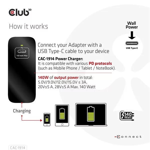 Club 3D Hálózati Adapter - CAC-1914EU (140W, GaN USB-C, PD 3.1)