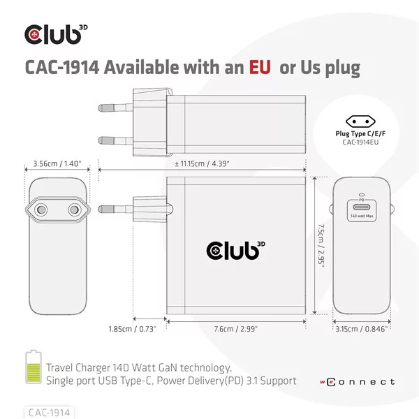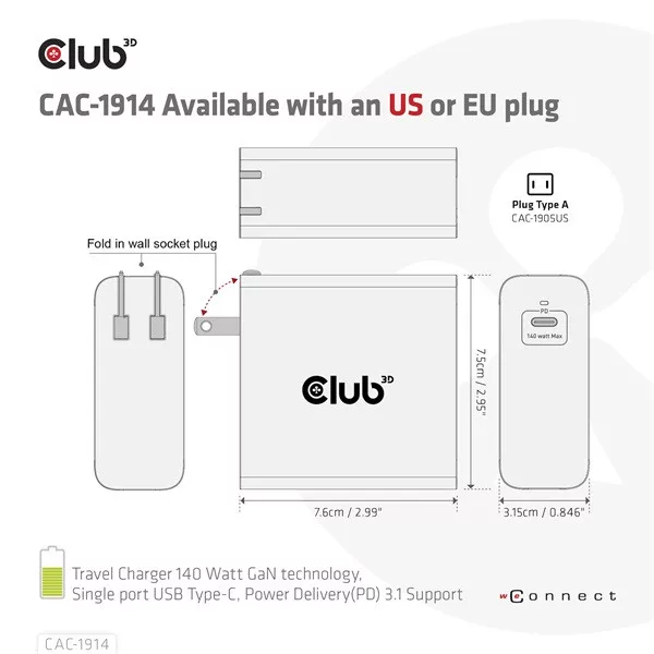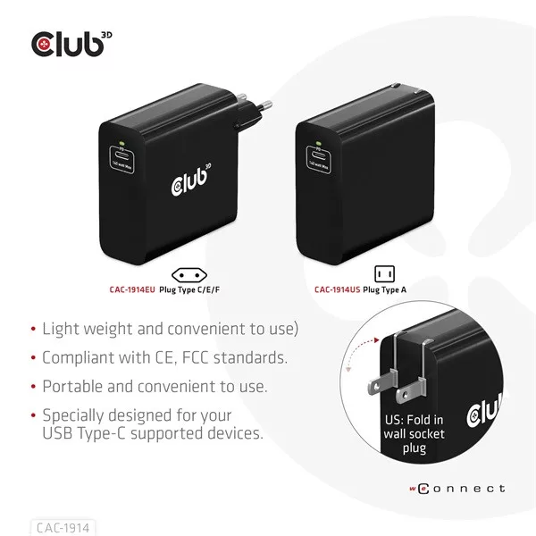 • CAC-1914 Utazó Töltő 140 Watt GaN technológiával, egyetlen port USB Type-C, Power Delivery(PD) 3.1 támogatás - hálózati csatlakozó (specifikálás megrendeléskor)