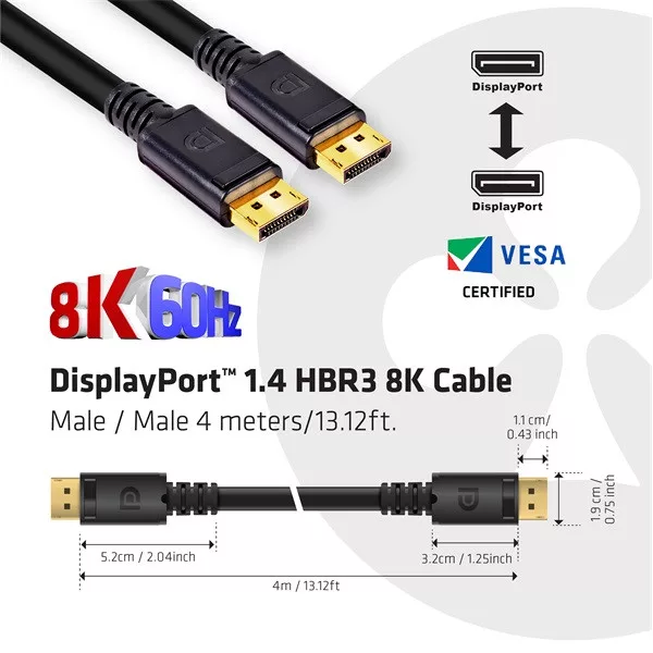 Club 3D Kábel - CAC-1069B (DisplayPort 1.4 HBR3, 8K@60Hz, 4m, 24AWG, fekete, VESA tanúsított, M/M)