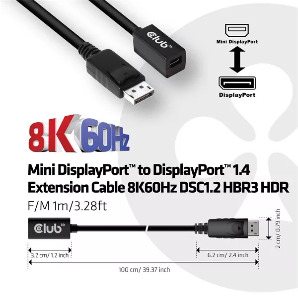 Club 3D Kábel - CAC-1120 (Mini DisplayPort 1.4 to DisplayPort, 8K60Hz, DSC1.2, HBR3, HDR, 1m, F/M, Kétirányú)