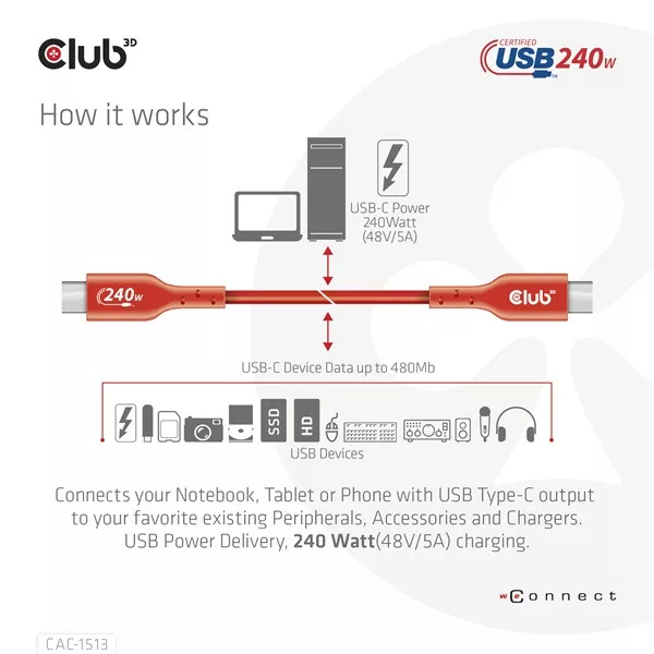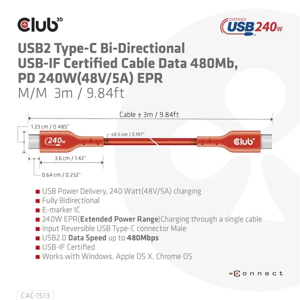 Club 3D Kábel - CAC-1513 (USB2 USB-C Bidirektional, 480Mb/s, PD 240W, USB-IF Certified, M/M, 3m)