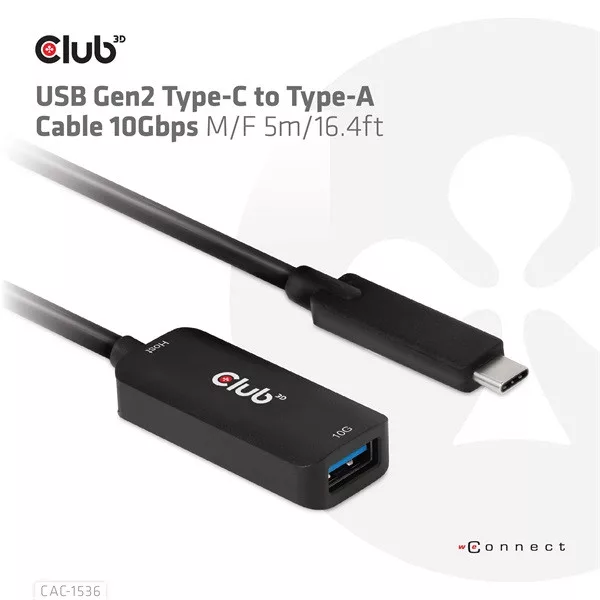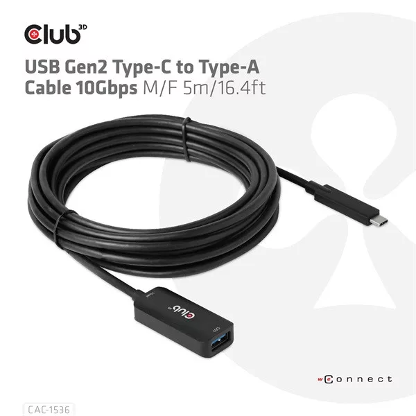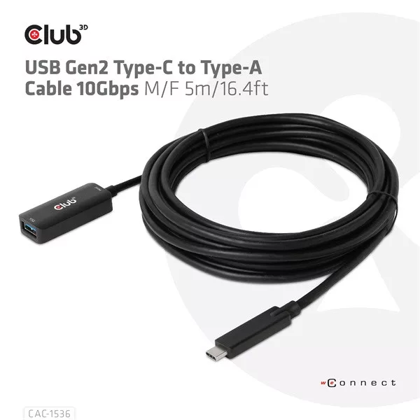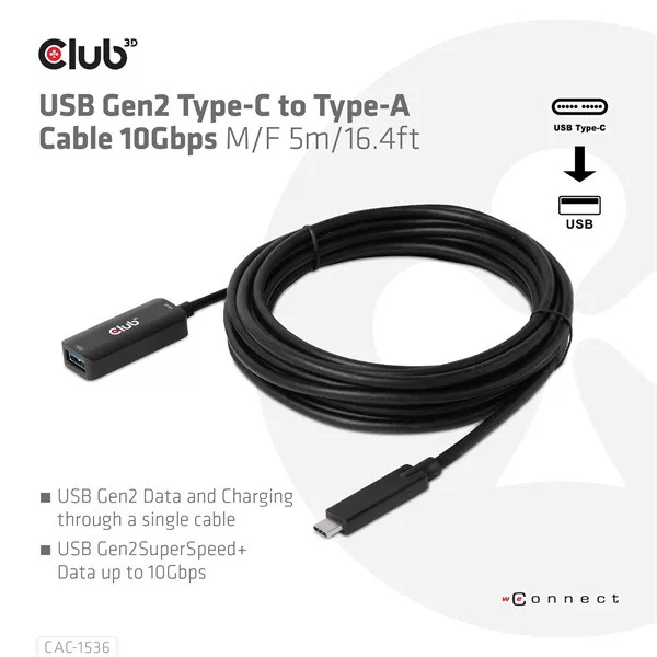 Club 3D Kábel - CAC-1536 (USB-C Gen 2 to USB-A, 10Gbps, M/F, 5m)