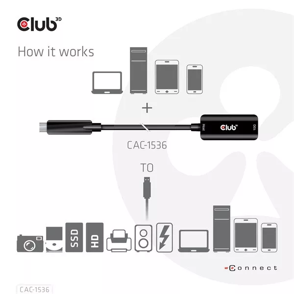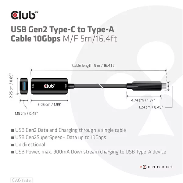 A Club 3D CAC-1536 USB Gen2 Type-C-A típusú kábel 10 Gbps M/F 5m/16,4ft kábel csatlakoztatja notebookját, táblagépét vagy telefonját USB Type-C kimenettel kedvenc meglévő perifériáihoz, tartozékaihoz és töltőihez, amelyek a közös USB Type-A csatlakozóval rendelkeznek. Lehetővé teszi az adatátvitelt és a tápellátást egyetlen kábelen keresztül. Ez a kábel támogatja az USB 3.2 Gen 2 szabványt. SuperSpeed+ adatátvitel 10 Gbps-ig és 900 mA kimenetig az A típusú USB-kompatibilis notebook, táblagép vagy okostelefon tápellátásához.