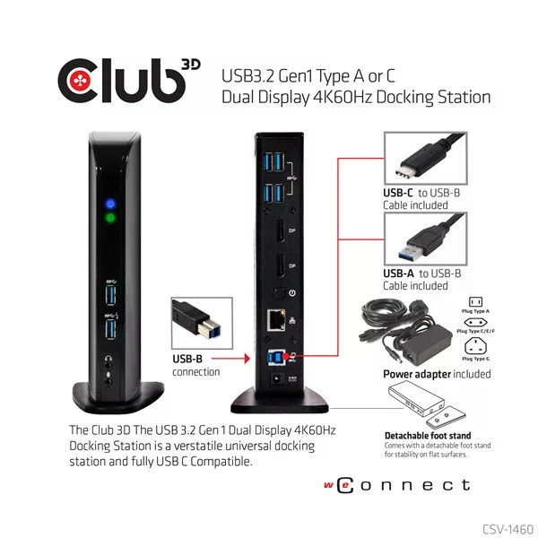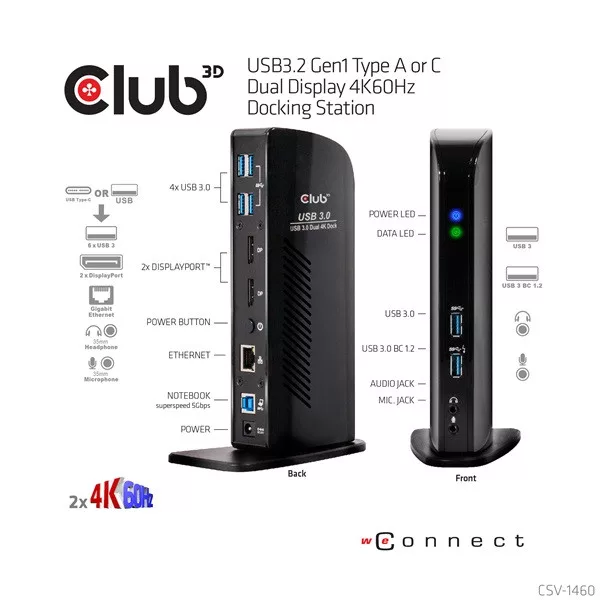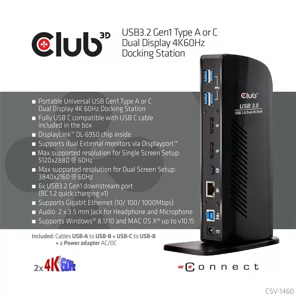 A Club 3D CSV-1460 USB3.2 Gen1 A vagy C típusú, kétkijelzős, 4K 60 Hz-es dokkolóállomást úgy tervezték, hogy minden csatlakozási igényt kielégítsen. Nem kevesebb, mint 6 USB3.2 Gen1 portot, fejhallgató- és mikrofoncsatlakozást, Gigabit Ethernet portot és 2 db Displayport™4K60Hz kimenetet biztosít.