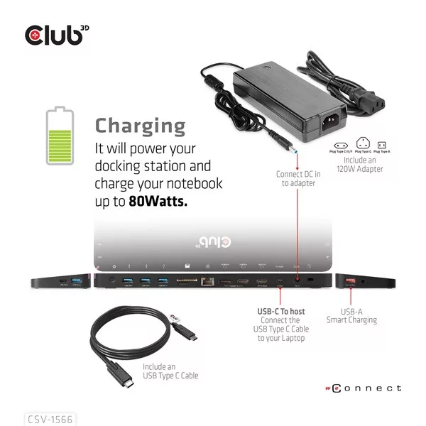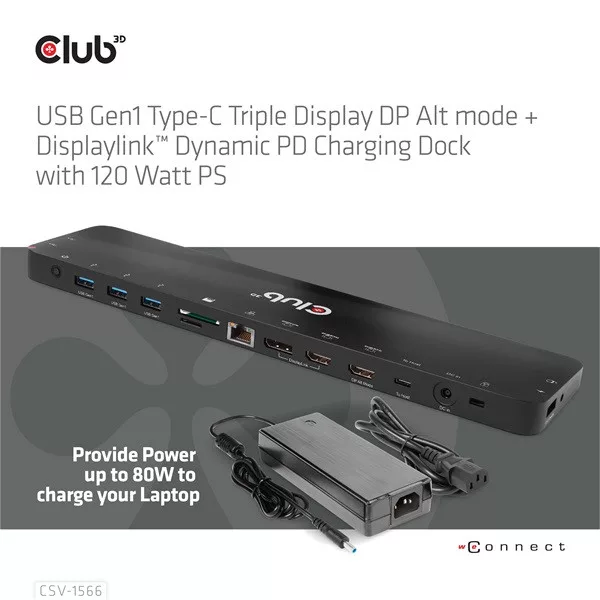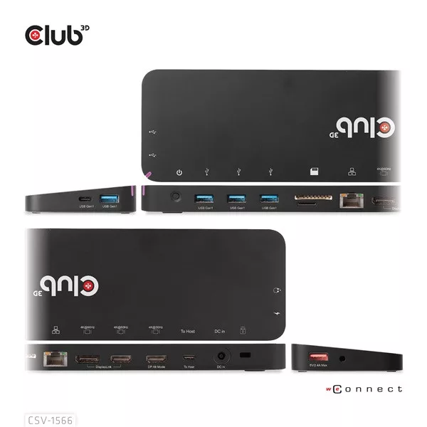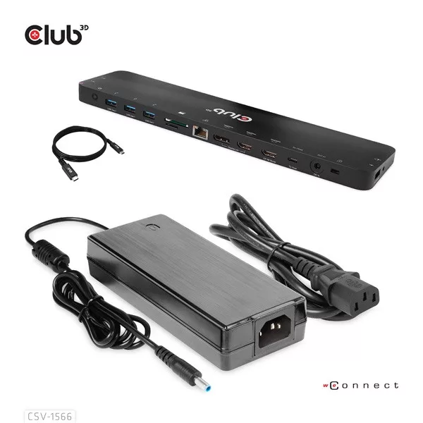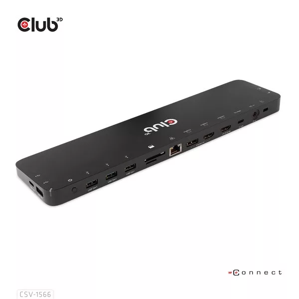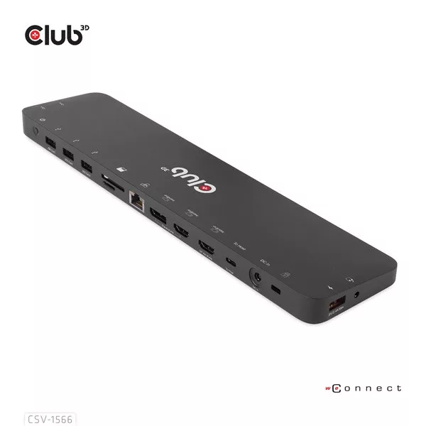 Club 3D Notebook Dokkoló - CSV-1566 (120W, USB-C to 5x USB-A Gen 1, USB-C Gen 1, 2xHDMI, DP, RJ45, SD.TF. 3,5 Jack, DC)