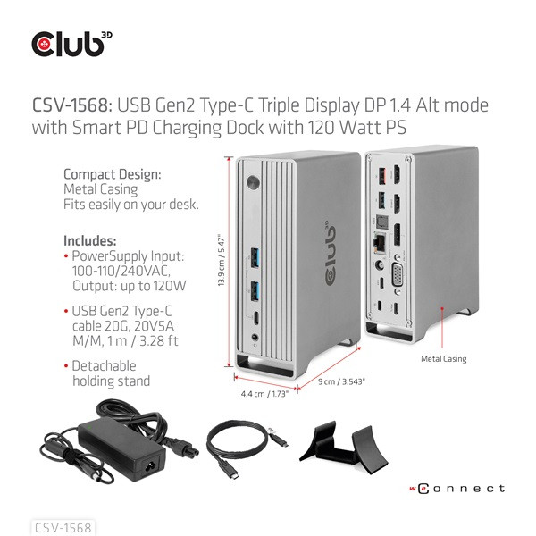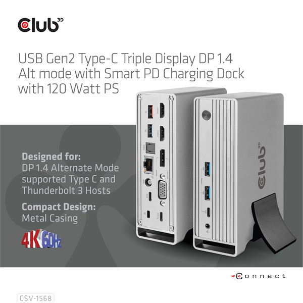 A Club 3D CSV-1568 USB Gen2 Type-C hármas kijelzős DP™ Alt mód + intelligens PD töltődokkoló 120 wattos tápegységgel egy integrált megoldás, amely egyesíti a videót, adatot, tápellátást, Ethernetet és hangot. 4 videóval rendelkezik (MST módban egyszerre 3 videót ad ki) a videó átvitelhez, 4 USB adatportot (2 USB-A 10G, 1 Type-C 10G, 1 USB-A 5G) az adatátvitelhez, 1 USB-A intelligens töltőportot a gyors töltéshez, 1 Gigabit Ethernet a szupergyors audióhoz, 3 audió porthoz Ezenkívül ez a dokkoló kettős tápcsatlakozóval van felszerelve (C típusú PD töltés vagy 120 W-os DC tápegység).