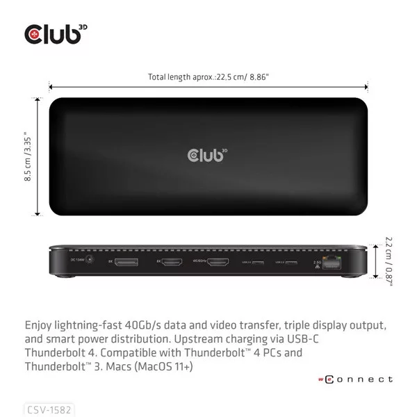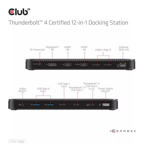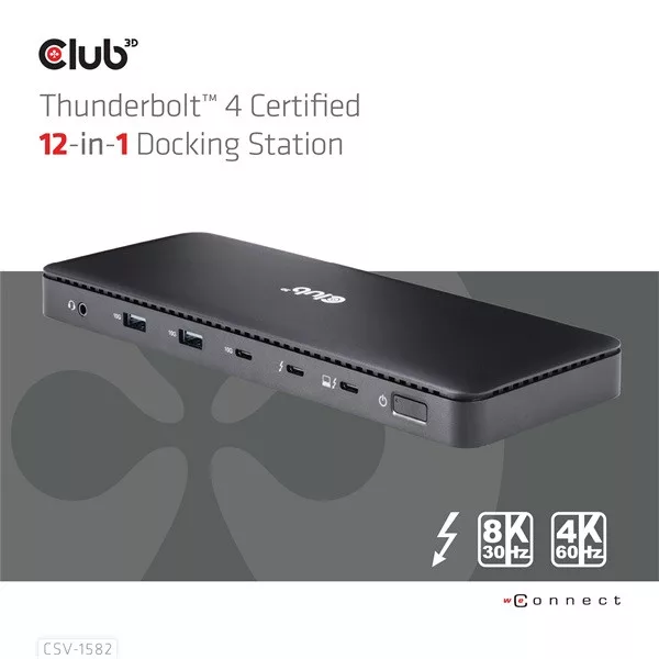 A Club 3D CSV-1582 egy tanúsítvánnyal rendelkező Thunderbolt™ 4 12 az 1-ben dokkolóállomás, amely a legfejlettebb, leghatékonyabb és legsokoldalúbb I/O megoldást kínálja akár 40 Gb/s adat- és videóátviteli sebességgel. A TB4 funkciók és az integrált dokkoló egyszerű kombinációja lehetővé teszi, hogy egyidejűleg 3 adatfolyamot 3 képernyőre adjon ki kiterjesztett asztali kijelzőkkel egy TB4/USB4 Windows PC-n. Az Ethernet RJ45 legfeljebb 2,5 G sávszélességet támogat. Az USB portok maximum 10G adatátvitelt támogatnak. A dokkoló támogatja az intelligens tápellátás funkciót, amely lehetővé teszi az energia elosztását a csatlakoztatott eszköz energiafogyasztásának megfelelően, teljes mértékben kihasználva a külső tápegységet. Thunderbolt™ 4 alapú PC-khez és Thunderbolt™ 3 alapú Mac-ekhez készült, amelyek MacOS 11 és újabb verziókat használnak.
