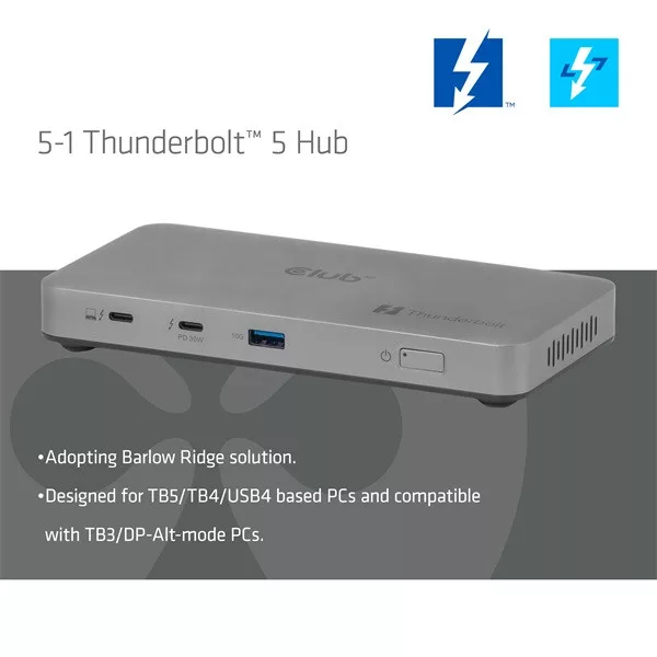 A Club 3D CSV-2563 egy tanúsítvánnyal rendelkező Thunderbolt™ 5 hordozható hub, amely a legfejlettebb, leghatékonyabb és legsokoldalúbb I/O megoldást kínálja akár 80Gbps vagy 120Gbps sebességgel adatok és videók számára.