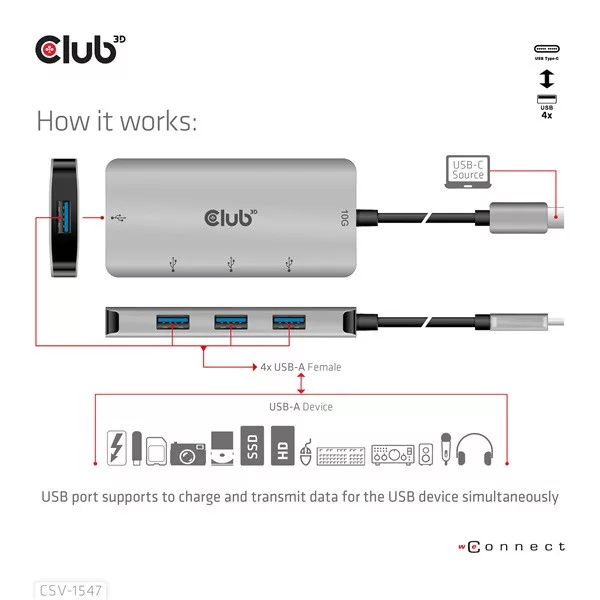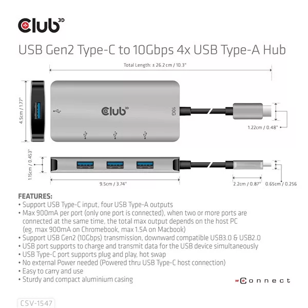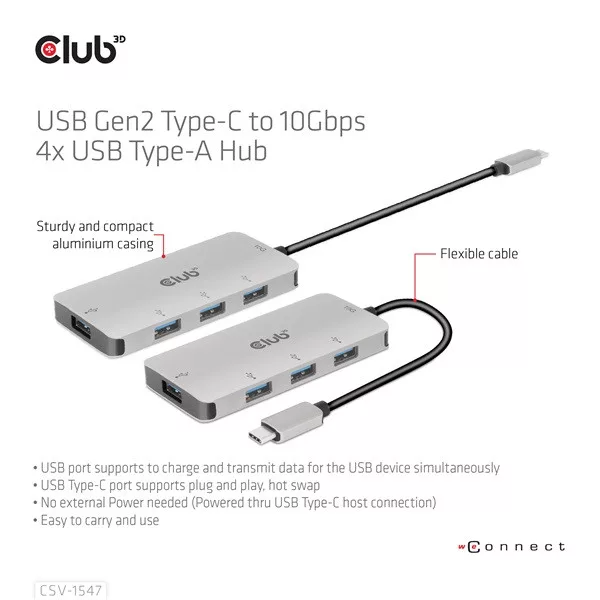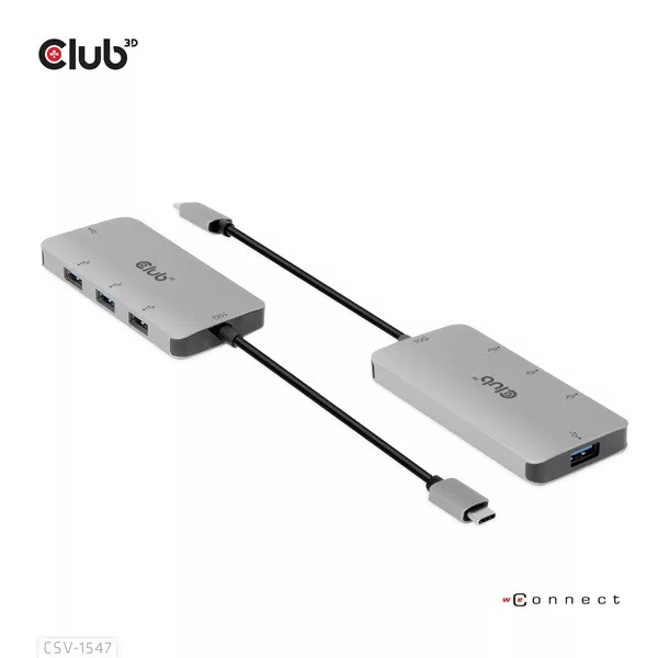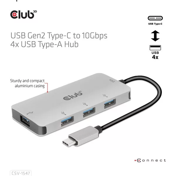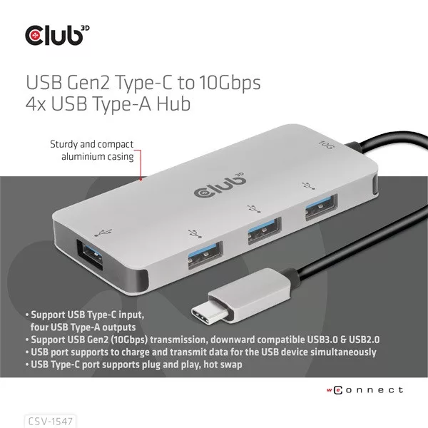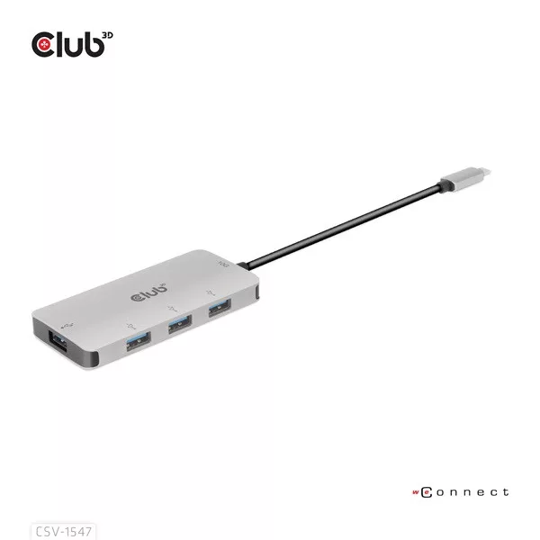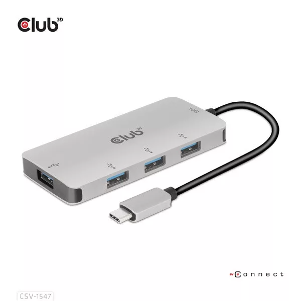 A Club 3D CSV-1547 egy USB Gen2 Type-C és négy USB Type-A port hub, amely négy általános USB Type-A portot ad hozzá az USB Type-C 10G kompatibilis eszközéhez adat- és töltéshez. Bármilyen C típusú gazdagépen működik (PC, notebook, táblagép, mobiltelefon stb.). Minden nagyobb operációs rendszerrel működik.
