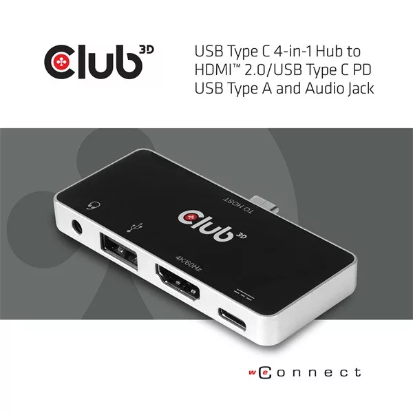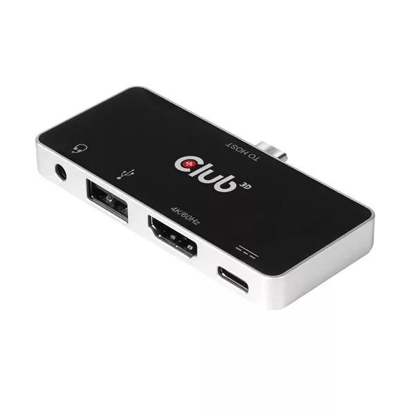 CSV-1591 – A Club 3D Hub egy 4 az 1-ben USB Type-C hub HDMI™, USB Type-A 2.0, 3,5 mm audio és USB Type-C PD töltéssel, a kialakítás tökéletesen illeszkedik az összes DP Alt módra képes eszközhöz. Ezzel a hubbal ultra nagy felbontású videót élvezhet a gazdagépről nagy képernyőn, élvezheti a fantasztikus zenét, továbbíthat USB 2.0 adatokat, és USB Type-C PD adaptert csatlakoztathat a gazdagép töltéséhez.