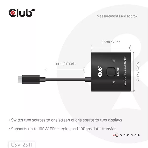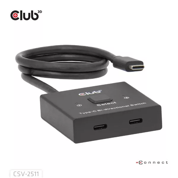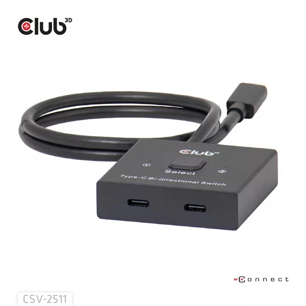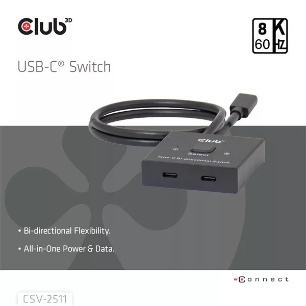 A Club 3D CSV-2511 teljes funkcionalitású kétirányú kapcsoló két forrás egyikét egyetlen kijelzőre, vagy egy forrás egyikét két kijelző egyikére válthatja. Ez a kapcsoló több felbontást és akár 8K, vagy maximum 10 Gbps adatátvitelt, illetve PD3.0 maximum 100 W-os PD töltést támogat. Minden USB-C® gazdagépen működik, kompatibilis a Thunderbolt eszközökkel.