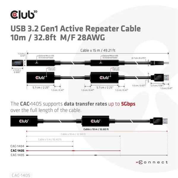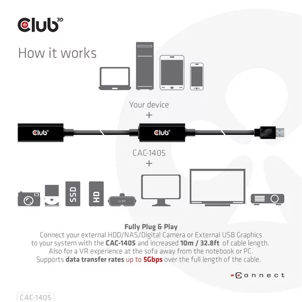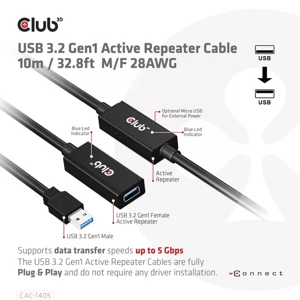 Ezzel a Club3D USB 3.2 Gen1 aktív átjátszó CAC-1405 kábellel messze túlléphet a szabványos USB-kábel 3 méteres hosszkorlátozásán az adatátviteli sebesség elvesztése nélkül. Az USB 3.2 Gen1 Active Repeater kábelek teljesen Plug & Play típusúak, és nem igényelnek semmilyen illesztőprogramot. Csak csatlakoztassa külső USB-eszközét, például külső HDD/NAS/digitális kamerát vagy külső USB grafikus kártyát a rendszeréhez a CAC-1405 segítségével, és élvezze a megnövelt 10 méteres extra kábelhossz rugalmasságát. A VR-élményhez a kanapén, távol a notebooktól vagy a PC-től is ez a kábel biztosítja a mozgás szabadságát.
