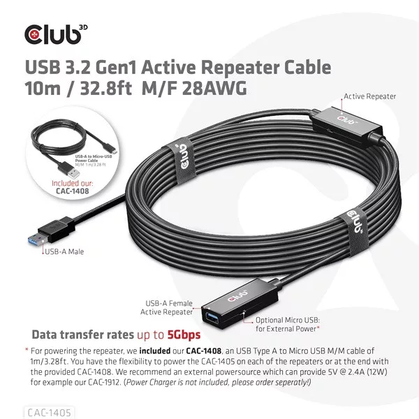Club 3D kábel - CAC-1405 (3.2 USB-A, Active Repeater, 5Gbps, 10m)