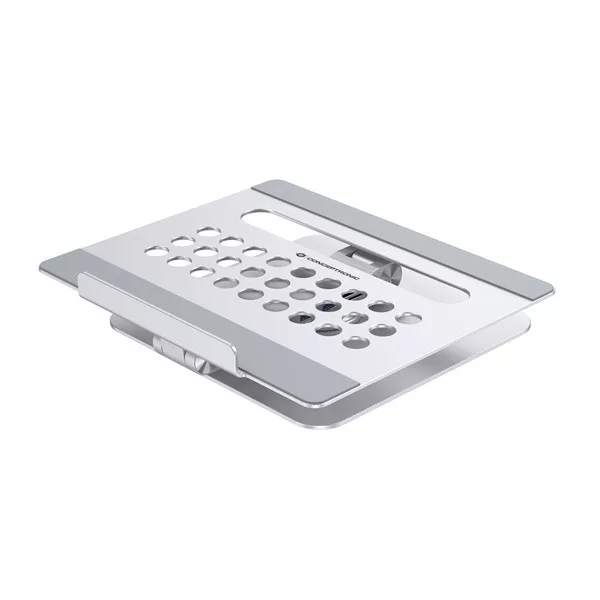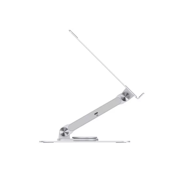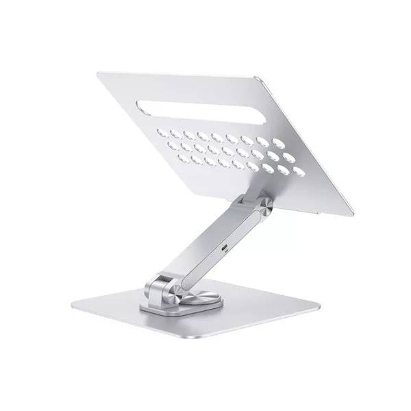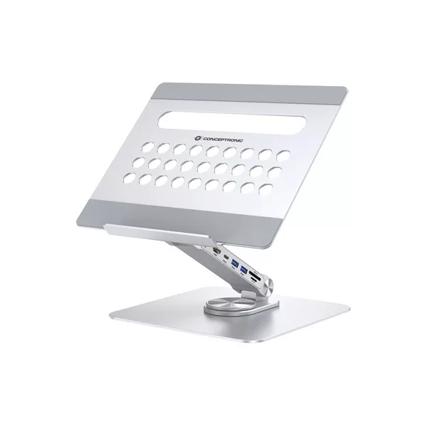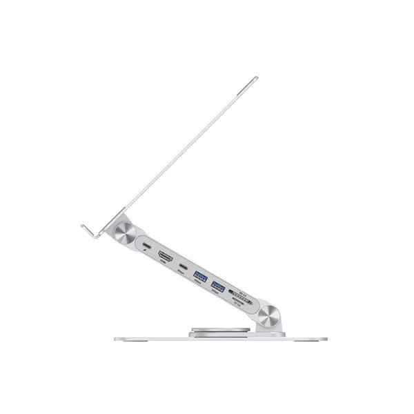 Enhance your laptop stand experience with our integrated 7-in-1 docking station, expanding your device's USB-C capabilities. The stand offers adjustable height and angle for optimal ergonomic positioning, along with a 360° rotating base for flexible working positions.