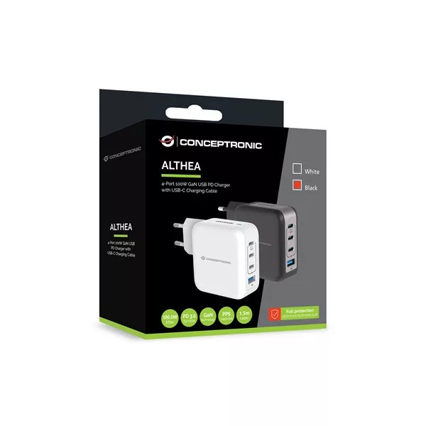 Conceptronic telefon töltő adapter+kábel - ALTHEA18B (3xUSB-C+USB-A, 100W, USB-C töltő kábel, fekete)