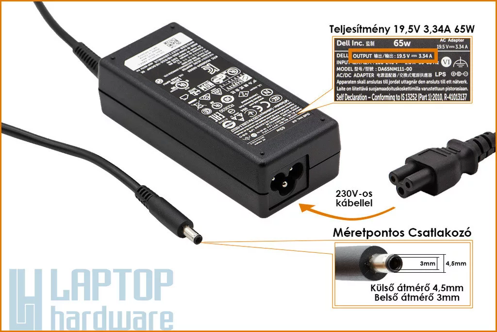 Dell 19,5V 3,34A 65 wattos eredeti gyári laptop töltő (043NY4). A legújabb fajta 2015-től kapható Dell Inspiron laptopokhoz. Csatlakozó méret 4,5 mm / 3 mm vékony center pin. A töltő helyettesítő verziója itt érhető el: Dell 19,5V 3,34A 65W vékony center pin helyettesítő laptop töltő