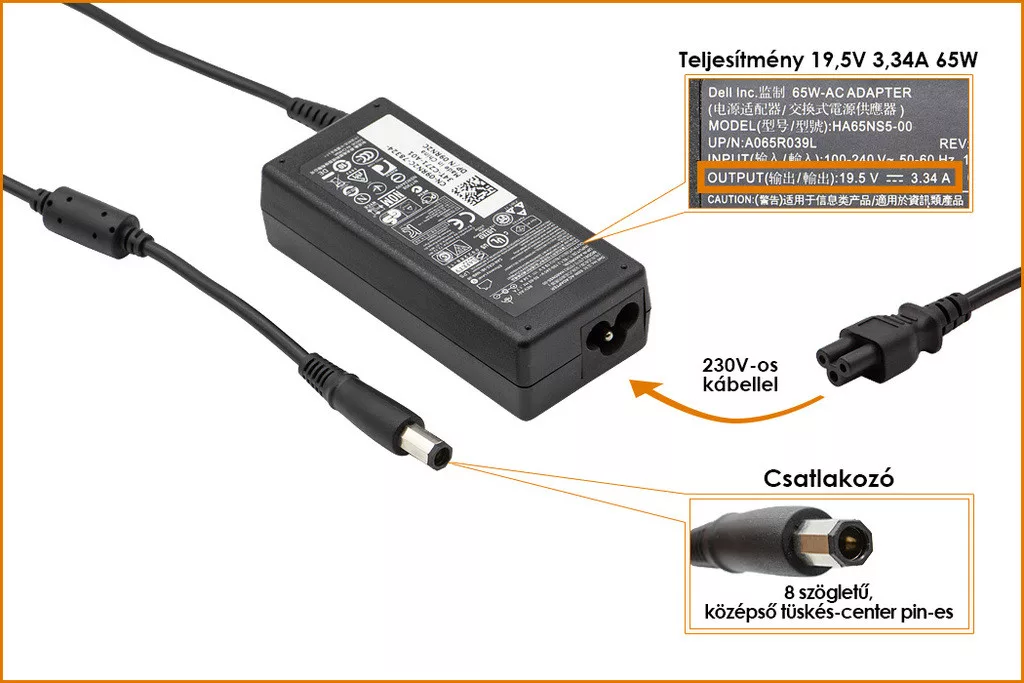 Dell PA-21 19.5V 3.34A 65W nyolcszögletű (octagonal) fejű gyári új töltő (NX061, HR763)