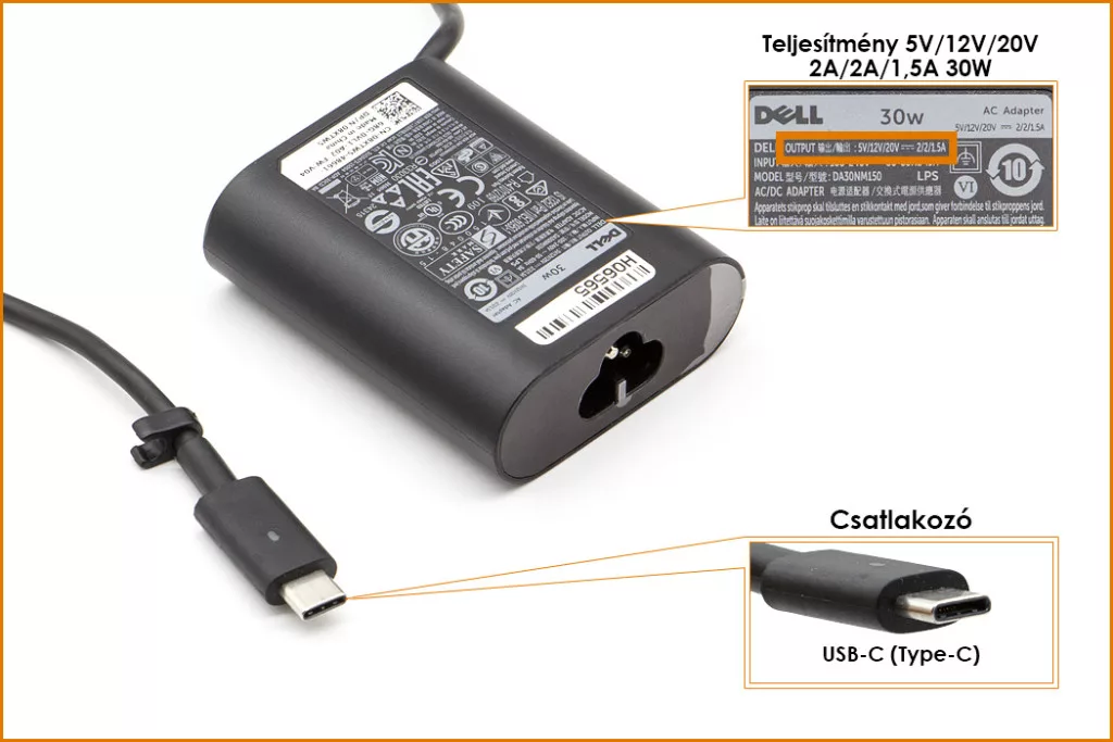 Dell gyári új 5V/12V/20V 2A/2A/1.5A 30W USB-C (Type-C) töltő (8XTW5, 08XTW5)