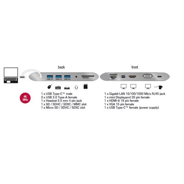 Ez a Delock dokkolóállomás egy USB-C™ váltakozó móddal vagy Thunderbolt™ 3 porttal rendelkező számítógéphez csatlakoztatható, és különféle csatolókat biztosít. A mini DisplayPort- és HDMI-kimeneteknél egyszerre két monitor, a VGA-kimenetnél pedig egy monitor működtethető. A három beépített, A-típusú USB-port lehetővé teszi, hogy perifériás eszközöket használjon, és fejhallgatót, gigabit hálózatot, illetve SD-/micro SD-kártyaolvasót csatlakoztasson. Az USB-C™ tápegységgel hordozható számítógépet, például MacBookot vagy Chromebookot tölthet használat közben.