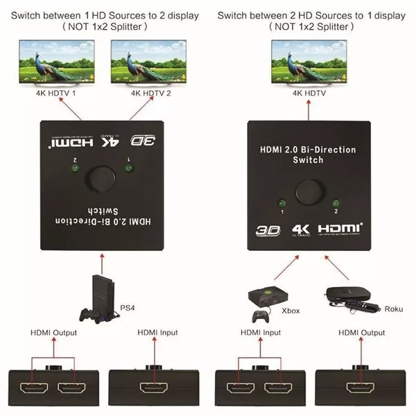 The equip HDMI Bi-directional Switcher/Splitter is very versatile as it can be used as either a 2 port switch or a 2 port splitter/selector. This means you have the option of using this with one host device (ie: Bluray Player, PS3, etc.) and have the signal sent to two displays (TV, Monitor, Projector, etc.), and then simply use the selector button to switch the signal back and forth between the displays.