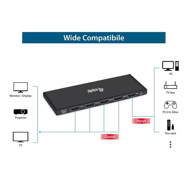 HDMI Splitter splits your HDMI device's audio and video signals on four screens, TVs or projectors with a resolution of UHD 4K/60Hz.