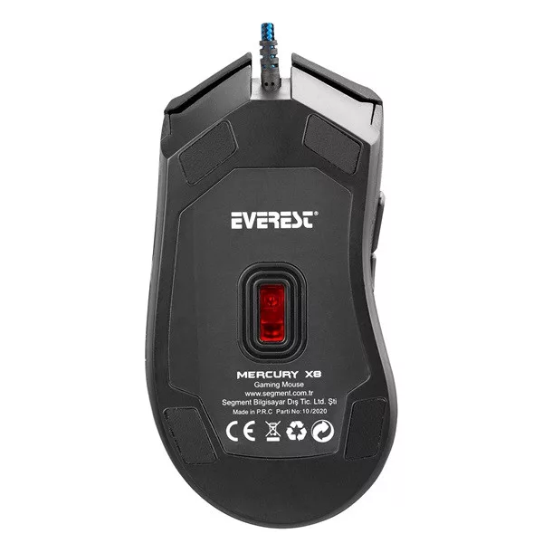 Everest Gamer Egér - Mercury X8 (3200 DPI, 6gomb, 1,8m harisnyázott kábel, optikai, fekete, RGB LED)