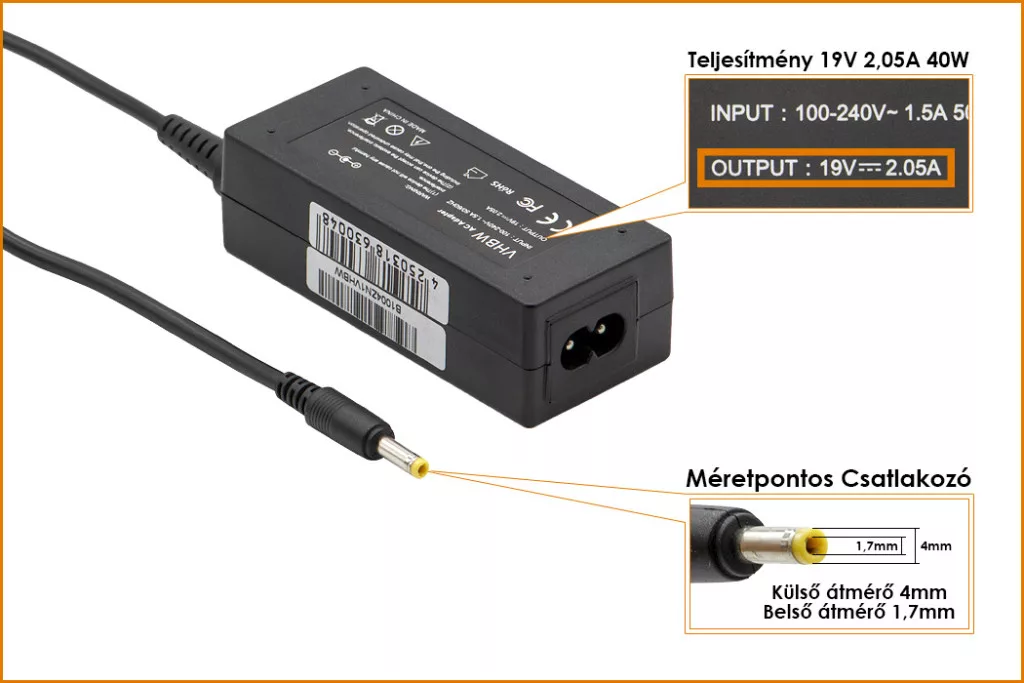 Kerek Csatlakozó méretei, amit a laptopba dugsz: kívül 4mm, belül 1,7mm!