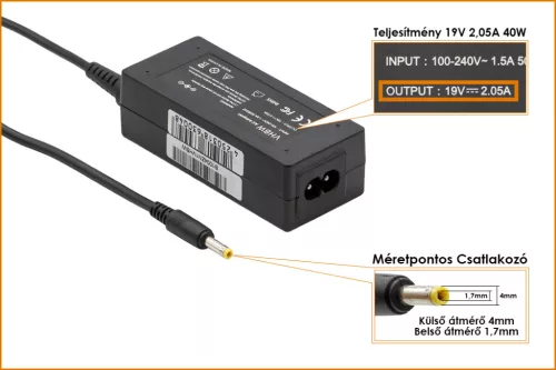 HP 19.5V 2.05A 40W (4mm-1,7mm kúpos fej) helyettesítő új töltő (PA1400-18HL, HSTNN-LA18)