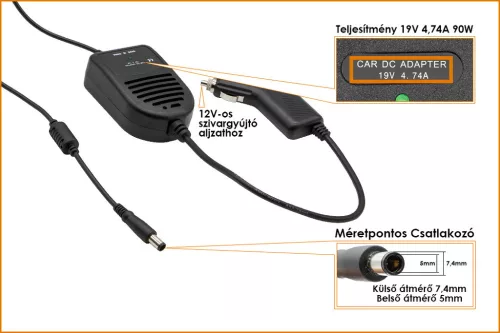 HP 19V 4.74A 90W (center pin) helyettesítő új autós töltő (ED495AA,384020-001)