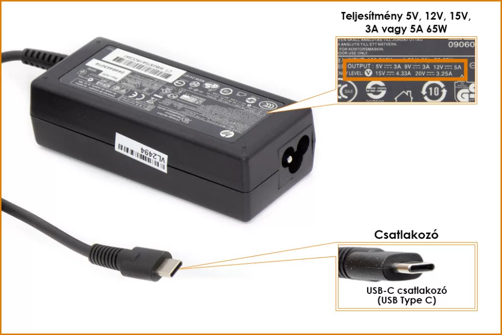 HP 20V 3.25A 65W USB-C (Type-C) laptop töltő (1P3K6AA)