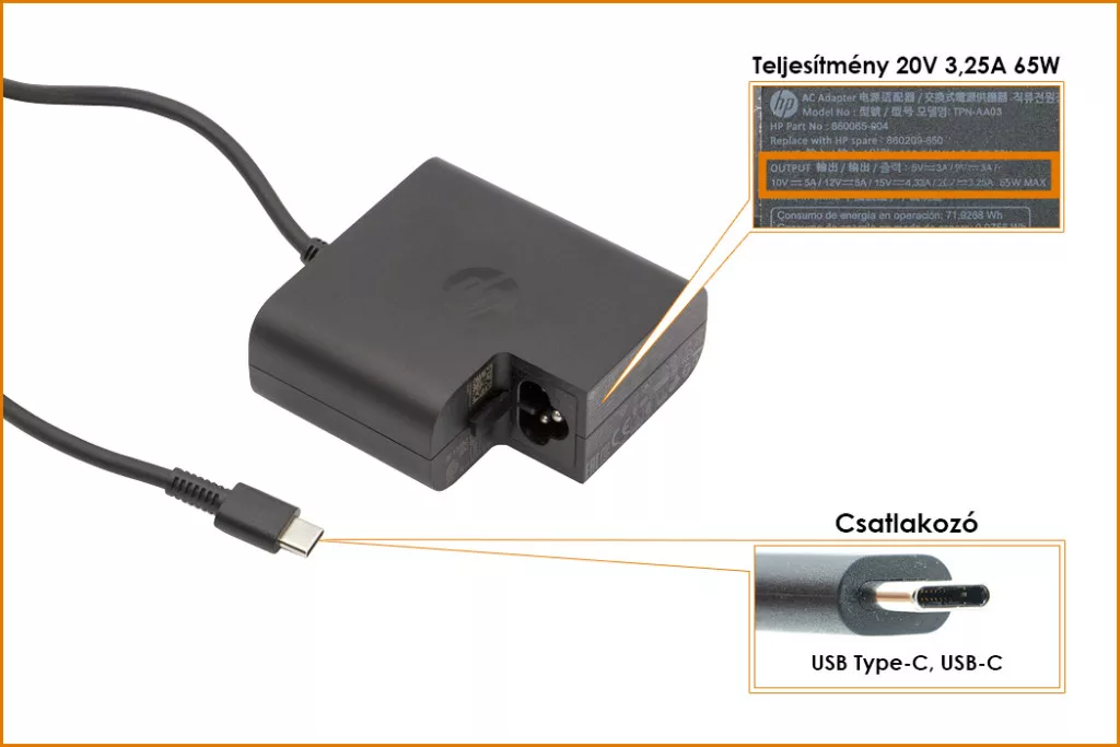 HP 65W 20V 3,25A gyári új USB-C (Type-C) töltő, kocka alakú (860209-850)