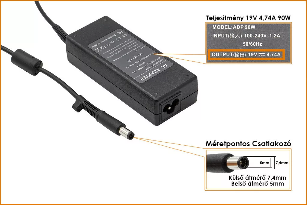 Kerek Csatlakozó méretei, amit a laptopba dugsz: kívül 7,4mm, belül 5mm!