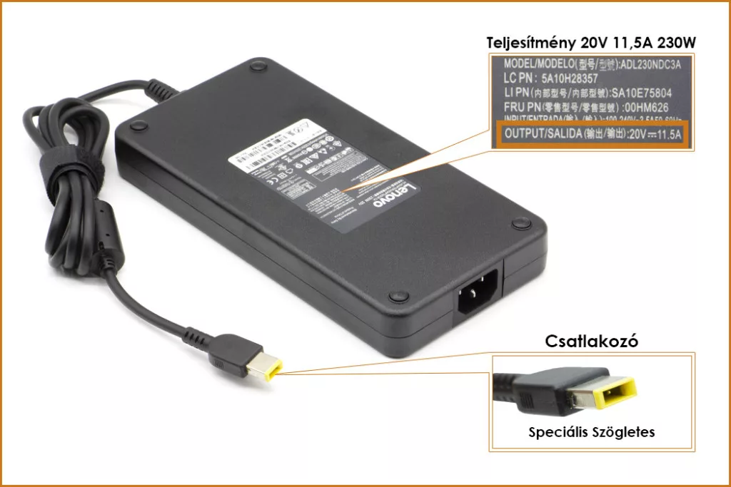 Lenovo 20V 11.5A 230W gyári új töltő, sárga téglalap alakú csatlakozóval (01FR046, 01FR044)