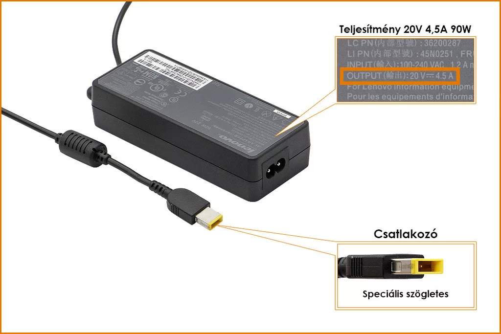 Lenovo 20V 4.5A 90W gyári töltő, sárga téglalap alakú csatlakozóval, 45N0483