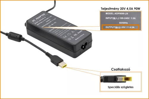 Lenovo 20V 4.5A 90W helyettesítő új töltő, sárga téglalap alakú csatlakozóval