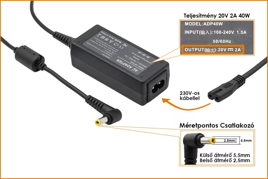 Kerek Csatlakozó méretei, amit a laptopba dugsz: kívül 5,5mm, belül 2,5mm!